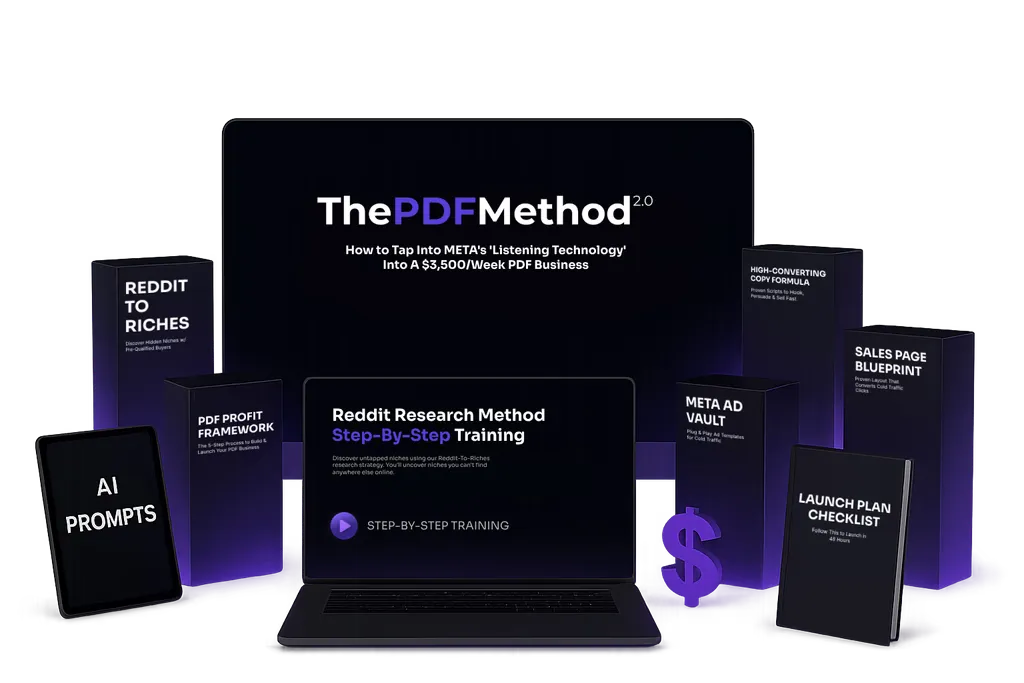 Kompletny system PDF Method 2.0 - wszystkie 8 modułów, gotowe szablony, prompty do AI, wszystko, czego potrzebujesz, żeby zacząć zarabiać na cyfrowych przewodnikach PDF za jedyne 97 pln.